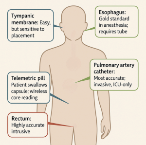 Esophageal temperature is also accurate but invasive and less commonly used.